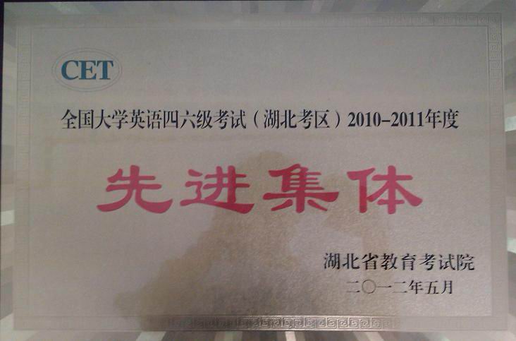 5月25日,湖北省教育考试院在华中农业大学国际学术交流中心召开大会,对全国大学英语四六级考试(湖北考区)先进集体和优秀个人进行表彰。我校继2010年被评为"全国大学英语四六级考试(湖北考区)2008-2009年度先进考点"荣誉称号之后,再次被评为全国大学英语四六级考试(湖北考区)2010-2011年度先进集体,同时王配军、柯尊严同志也再次被评为"全国英语四六级考试先进个人"荣誉称号。 (柯尊严)