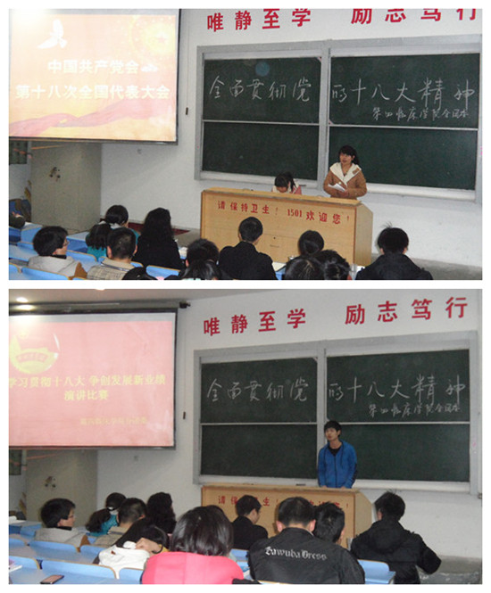 本次活动共有7名选手进入决赛,各选手分别从十八大报告的主要内容、学习十八大的感想、十八大对大学生的指导意义、如何贯彻落实十八大精神等方面阐释了自身对“十八大”的认识。大家为这次比赛做好了充分的准备,PPT、背景音乐、演讲搭档等都经过了选手的精心安排,演讲者的激情更让听众不断地献上热烈掌声。