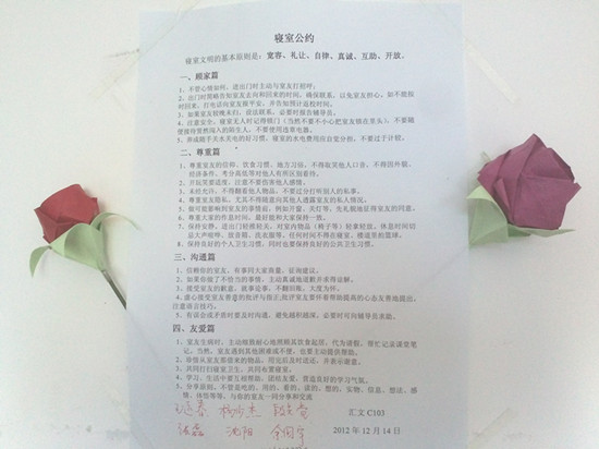 在汇文公寓有这样一个宿舍,六个来自两个班级的室友,他们积极向上,多元发展;有着整洁清新的室内环境、浓郁的文化气息、励志的标语、精致的折纸花,这就是汇文C103宿舍,一个年轻的宿舍。
