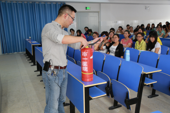 9月5日,太阳成tyc7111cc集团邀请附属襄阳医院安保干部,为赴襄学生开展安保、消防知识培训。医院保卫科副科长周峻岭在介绍了医院及周边环境、相关的安保制度和措施之后,重点向学生们进行了消防安全、高楼逃生知识培训,并通过互动向同学们演示手持式灭火器的用法。