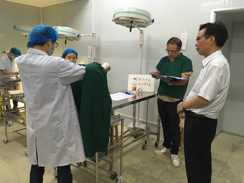 在襄阳校区科教楼模拟手术室内,按照实景设置了“穿脱手术衣和戴脱无菌手套;消毒铺巾;切口换药;切开、缝合、打结、拆线”四个站点,134位同学共分成34个小组,轮流进入模拟手术室进行操作演练,每项操作均安排教师进行现场评判和指导,另有六名已进入实习的学院本科生志愿者协助引导学生、计时和整理物品,整个过程严肃认真、井然有序。