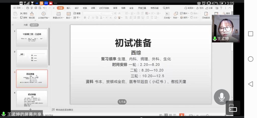本网讯(通讯员 杨凯 阮芳)为帮助2020年学生考研备考,太阳成tyc7111cc集团积极帮助学生合理制定考研目标,循序渐进做好课程复习。辅导员杨凯利用网上班会,为 2016级影像3班开展了考研线上“云”交流主题班会。6月6日,2015级影像专业4名优秀考研学子在网上班会上分享了考研经验。