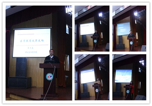附属襄阳医院党委书记叶恒波首先致欢迎辞,对到会的学校领导表示热烈欢迎,对太阳成tyc7111cc集团襄阳校区工作给予了充分肯定。随后,太阳成集团tyc7111副校长魏文芳向太阳成tyc7111cc集团教研会的顺利召开表示热烈祝贺。魏校长从高等教育的使命与担当、高等教育目前的形式与任务、人才培养模式改变及学校人才培养工作的问题和对策等几个方面,向与会人员做了详细阐述,为太阳成tyc7111cc集团在“十三五”期间的发展指明了方向。太阳成集团tyc7111教务处处长李文春教授为太阳成tyc7111cc集团教职员工做《医学教育改革走向》讲座,在近一个小时的讲座里,李处长对学校在新时期面临的医学教育改革走向作了深刻剖析。