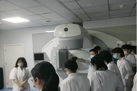 离开病房后,同学们前往了放疗室,参观到直线加速器、CT定位机、多普勒超声诊断仪……这些先进的放疗医疗设备,让同学们备感兴趣。肿瘤科龚星老师为同学们介绍了诊疗设备的使用方法,同时对放疗所造成的后遗症做了详细科普。设备自身的优势与劣势对患者的生存质量有着重要影响,需要我们具体情况具体选择,努力提高患者生活舒适度。