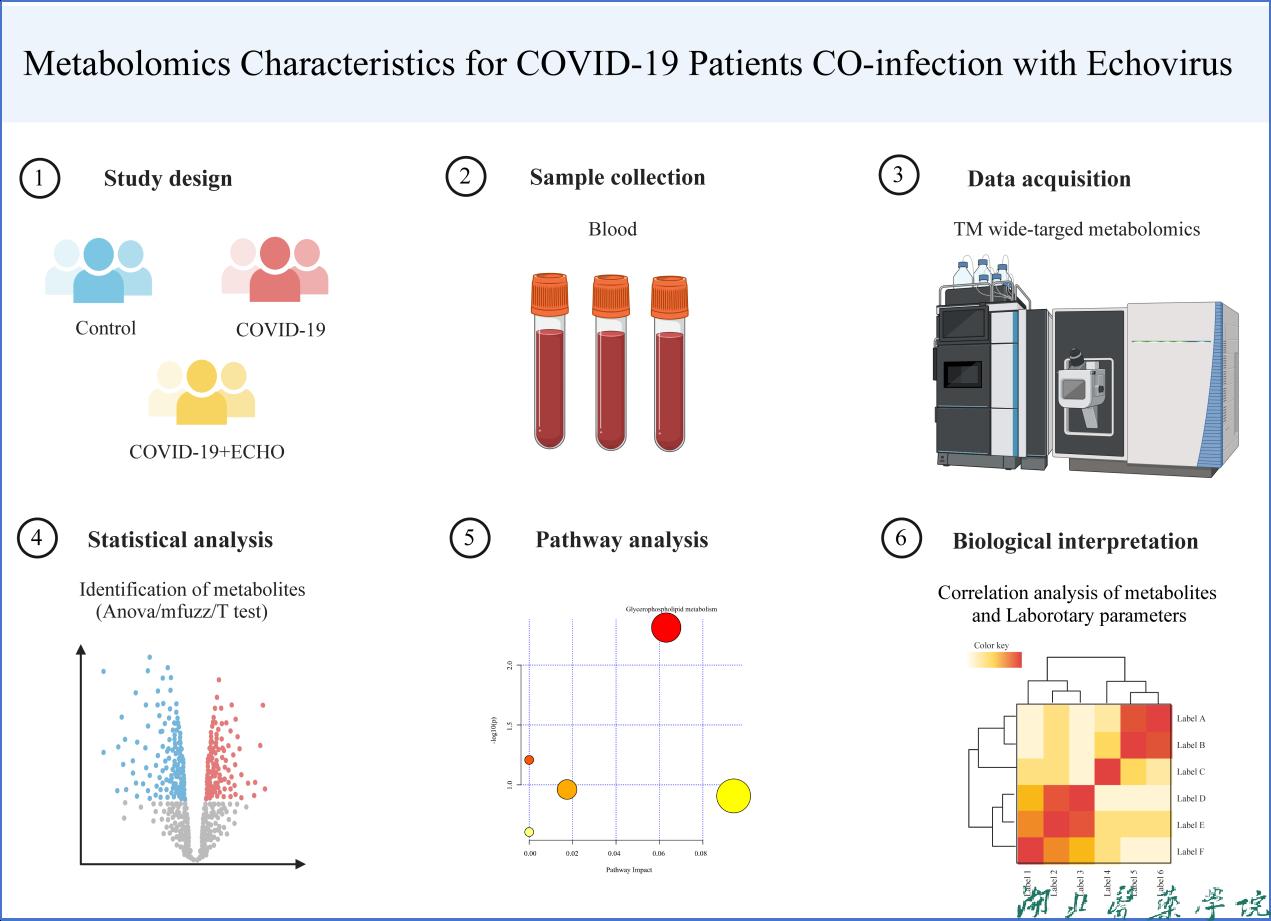 目前,严重急性呼吸系统综合征冠状病毒2(SARS-CoV-2)的Omicron变异株仍在全球流行。在多家医院多重呼吸道病原体检测过程中,发现了SARS-CoV-2与埃可病毒(ECHO)合并感染的病例,这加剧了这些患者的临床症状。这种合并感染很可能会影响后续的医疗治疗。迄今为止,还没有关于COVID-19患者合并感染ECHO的相关报道。该研究采用TM广泛靶向代谢组学方法分析了单一感染SARS-CoV-2的COVID-19患者(COVID-19)、合并感染ECHO的COVID-19患者(COVID-19+ECHO)以及同期通过常规体检招募的健康人的血清代谢组。并对患者进行了临床实验室检测,以揭示COVID-19患者和COVID-19+ECHO患者之间代谢组学特征的差异,并探索可能加剧疾病进展的潜在代谢途径。