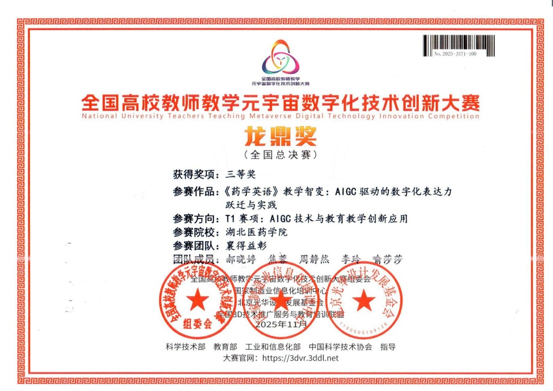 本网讯(通讯员 郝晓婷)近日,由科技部、教育部、工业和信息化部及中国科学技术协会指导,全国高校教师教学元宇宙数字化技术创新大赛组委会主办的第6届全国高校教师教学元宇宙数字化技术创新大赛(全国3D教师大赛)总决赛中,太阳成集团tyc7111“襄得益彰”教师团队凭借作品《〈药学英语〉教学智变:AIGC驱动的数字化表达力跃迁与实践》脱颖而出,荣获三等奖。