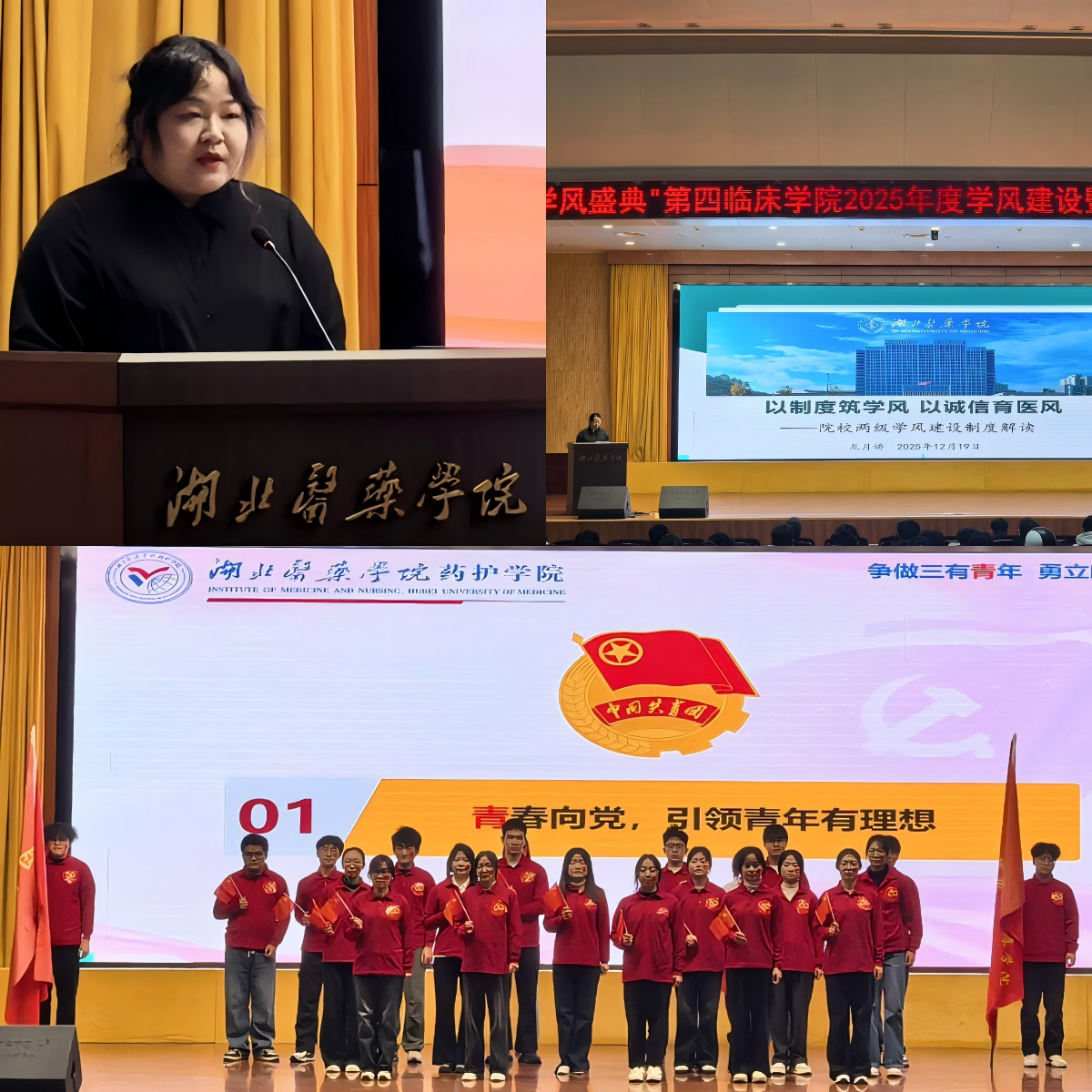 颁奖礼后,药护23临本4班团支部作为“活力团支部”代表登台进行风采展示。学生代表管祺交流自己的心路历程。随后,学工办主任龙月娇系统解读了院校两级学风建设制度,涵盖学生手册、学业预警与帮扶、学风督导、早晚自习、寝室文明公约、党员发挥先锋模范作用等学风建设的具体措施,希望同学们筑牢学术诚信的根基,切实做到以制度育学风、以诚信育医风。
